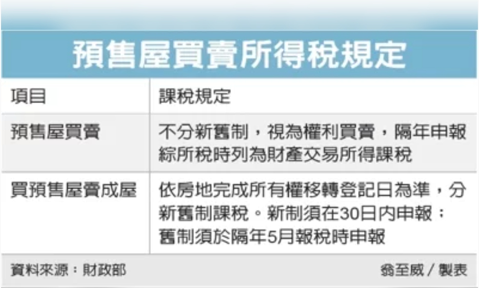 財政部表示,預售屋買賣與一般成屋買賣不同,不分新制或舊制,由於買方所購買的是未來建案完工後,請求不動產過戶給買方的「權利」,賣方須將扣除成本後實際轉取的所得,在隔年申報綜所稅時,列為財產交易所得課稅。