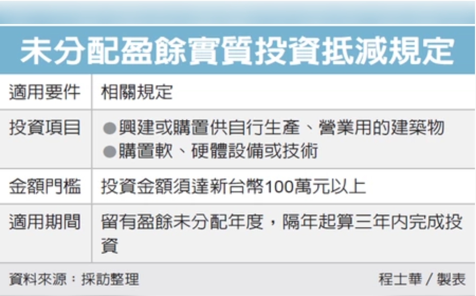 未分配盈餘投資抵減今年上路,中區國稅局表示,舉凡投資於生產或營業用建築物、軟硬體設備及技術,不論是新增資產,或現有資產修繕,都有機會滿足抵減條件。目前企業年度獲利的未分配盈餘,會被額外加徵5%保留盈餘稅,官員表示,《產業創新條例》去年修法後新增第23-3條,開放企業以未分配盈餘進行實質投資,即可以投資額減除原本應繳納的保留盈餘稅。